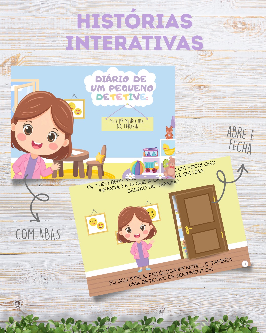 🕵️‍♀️ Com abas que abrem e fecham, a criança participa da narrativa, explora emoções e descobre, junto da psicóloga Stela, que terapia também pode ser um espaço de aventuras e descobertas.